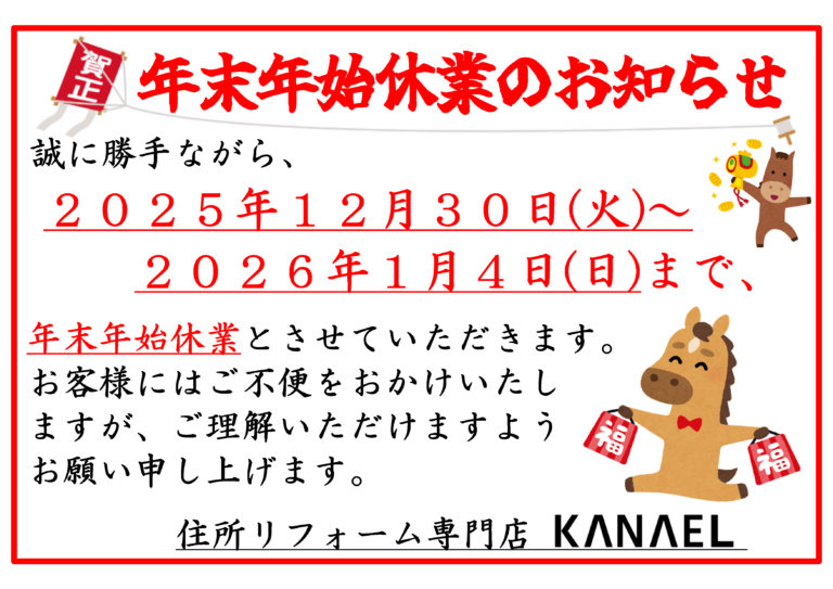 2025年12月30日(火)〜2026年1月4日(日) 年末年始休業のお知らせ 2025年12月23日 新着情報 平素よりご愛顧を賜り、誠にありがとうございます。 当店は、2025年12月30日(火)〜2026年1月4日(日)の間、 誠に勝手ながら、年末年始休業とさせていただきます。 期間中はご不便をおかけいたしますが、何卒ご理解賜りますようお願い申し上げます。 新年も変わらぬご愛顧のほど、よろしくお願い申し上げます。 前の記事リニューアルオープンのお知らせ