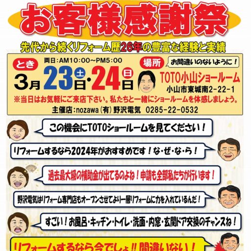 3月23日(土)、24日(日)「住宅リフォームお客様感謝祭」inTOTO小山ショールーム開催
