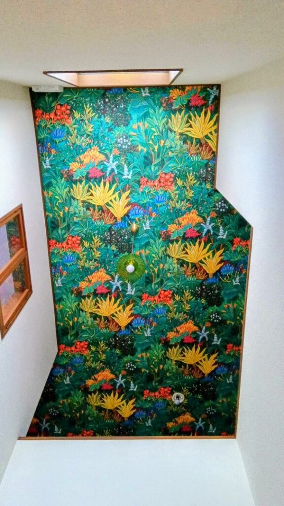 吹抜け天井に緑豊かなジャングルイメージのクロスを施工しました。天井に視線を向けると広がる瑞々しい緑が、癒しと開放感を演出。まるで自然の中にいるような心地よさを感じられます。