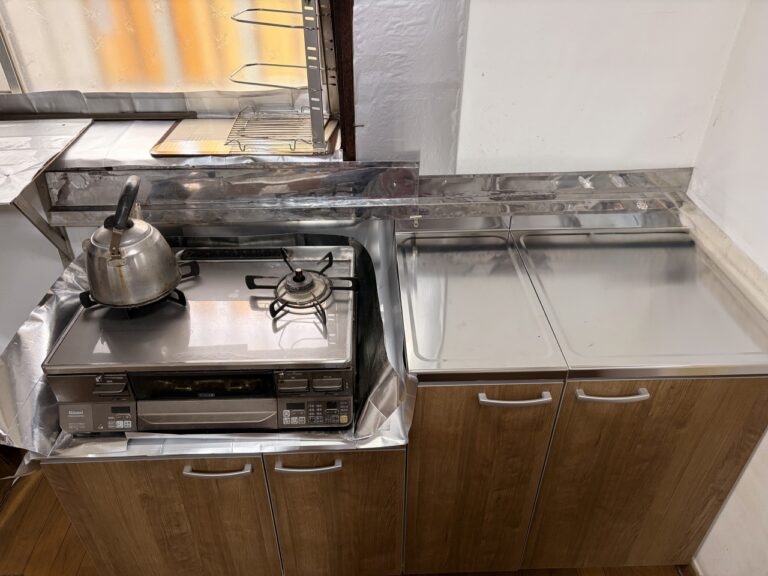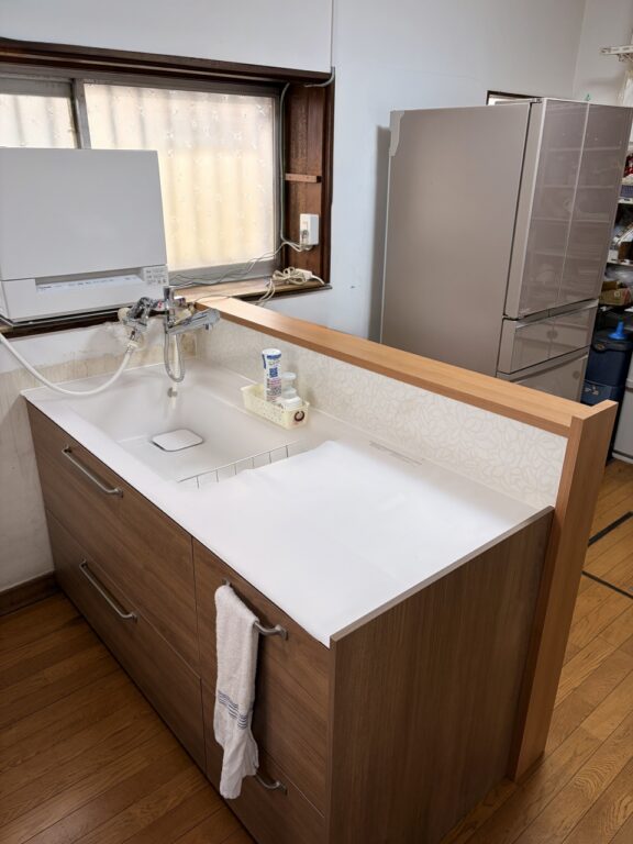 ご相談のきっかけは「使っていないシンクを減らしたい」というお悩み。出窓スペースを有効活用しながら、手の届きやすい高さ・奥行きを確保するため、レイアウトから見直しました。既存の露出配管を活かしつつ、使い勝手を考慮してシンク位置を細かく設計。体の向きを変えるだけで作業ができる、効率的な動線へと改善しています。