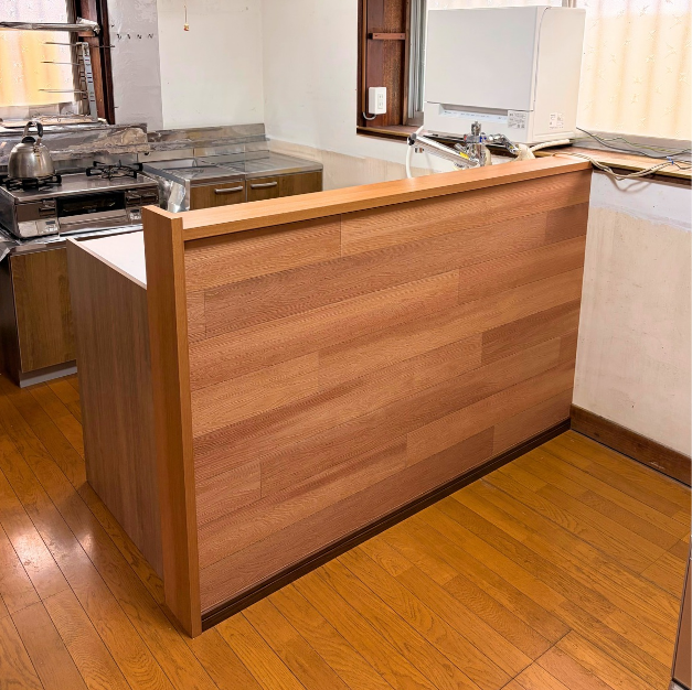 セクショナルキッチンの側面は基本的には白系の仕上げですが、今回はシンク側のエンドパネルに色味を合わせ、シートで丁寧に化粧仕上げを行いました。異なるメーカー製品を組み合わせながらも、細部まで調整することで統一感のあるキッチン空間を実現しています。